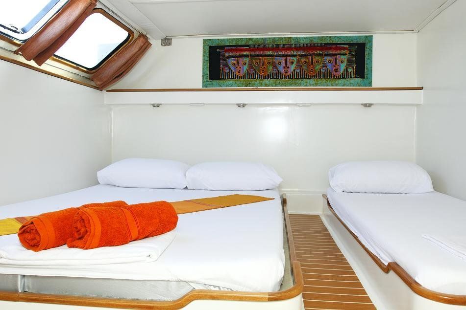 This trip is accommodated on board a 58 foot, twin-hulled sailing catamaran. Our boat is equipped with 3 x double-share (double cabin) and 2 x quad-share cabins (master cabin) each with en-suite bathrooms and fans.